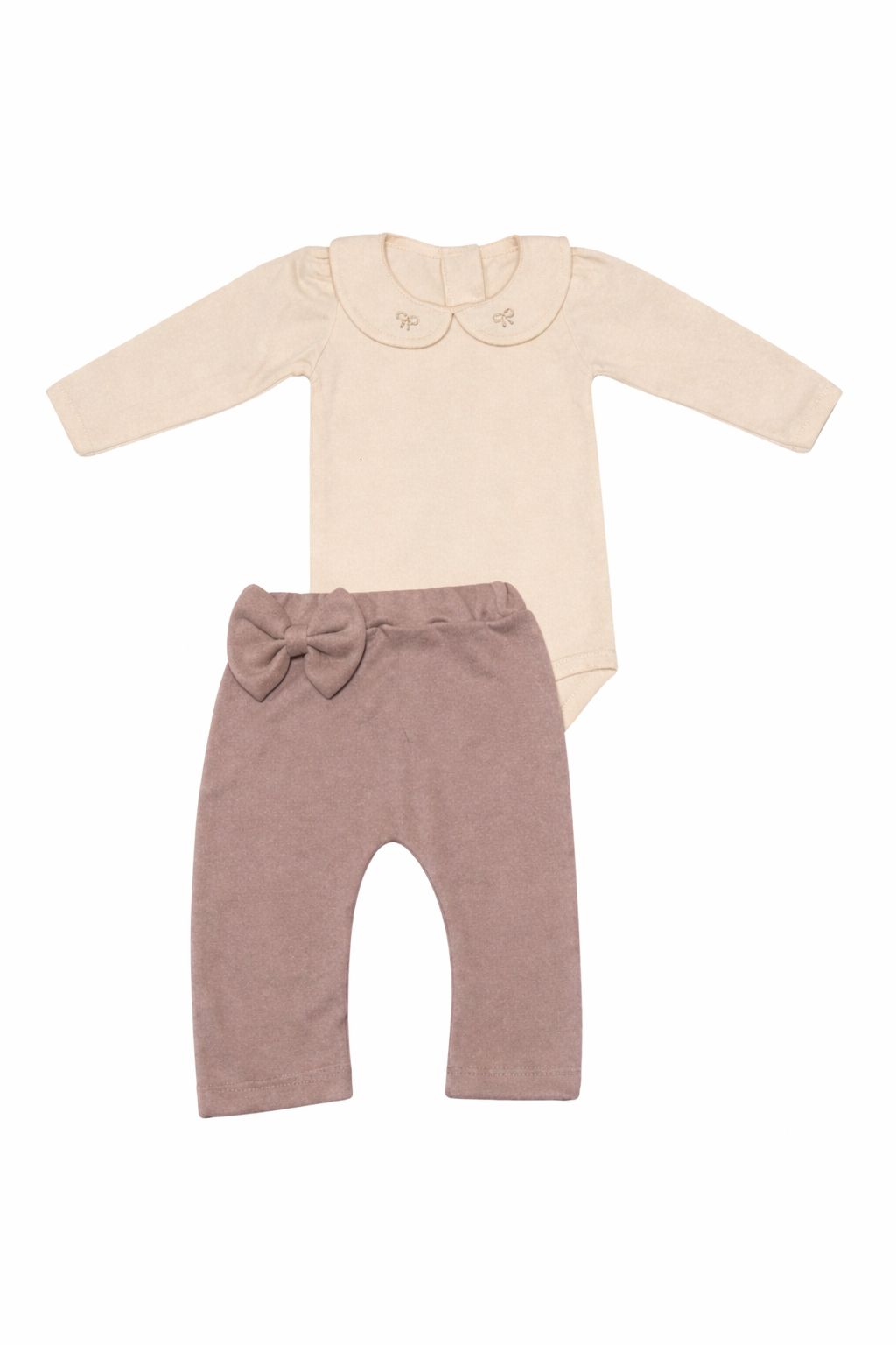 O body manga longa conta com gola envelope e botões de pressão entre as perninhas, facilitando as trocas e o vestir. A calça possui cós confortável com ajuste suave e um delicado laço decorativo, que adiciona um charme especial à peça.
