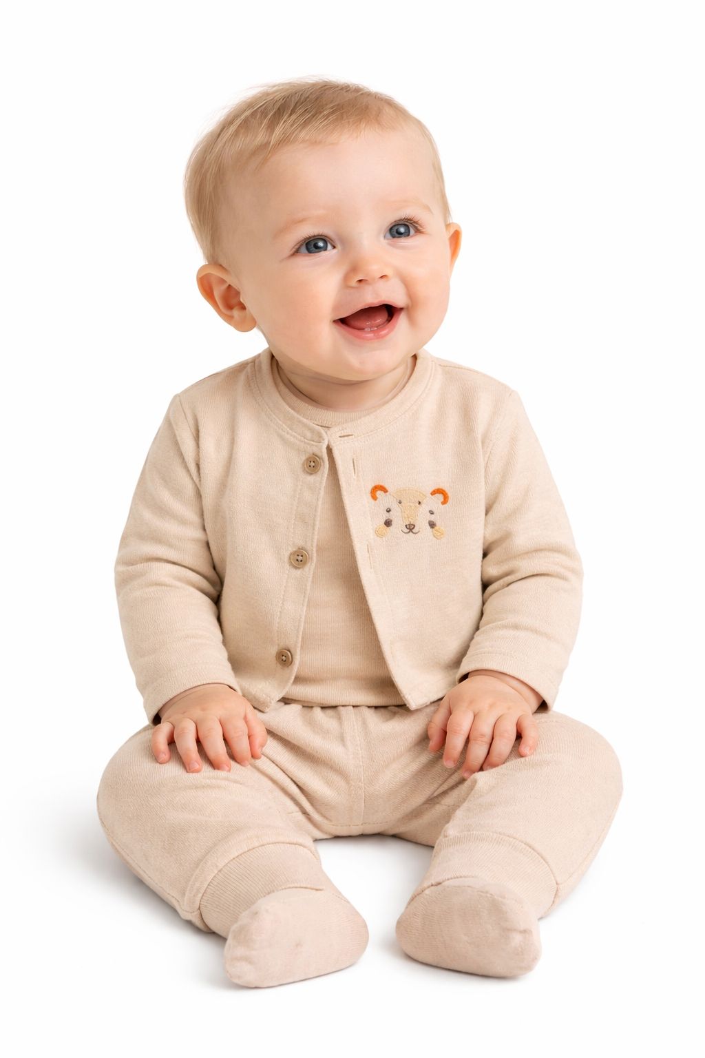 Confeccionado em suedine penteado 100% algodão, o conjunto proporciona um toque macio, leve e respirável, cuidando com delicadeza da pele sensível do recém-nascido e garantindo bem-estar em todos os momentos.