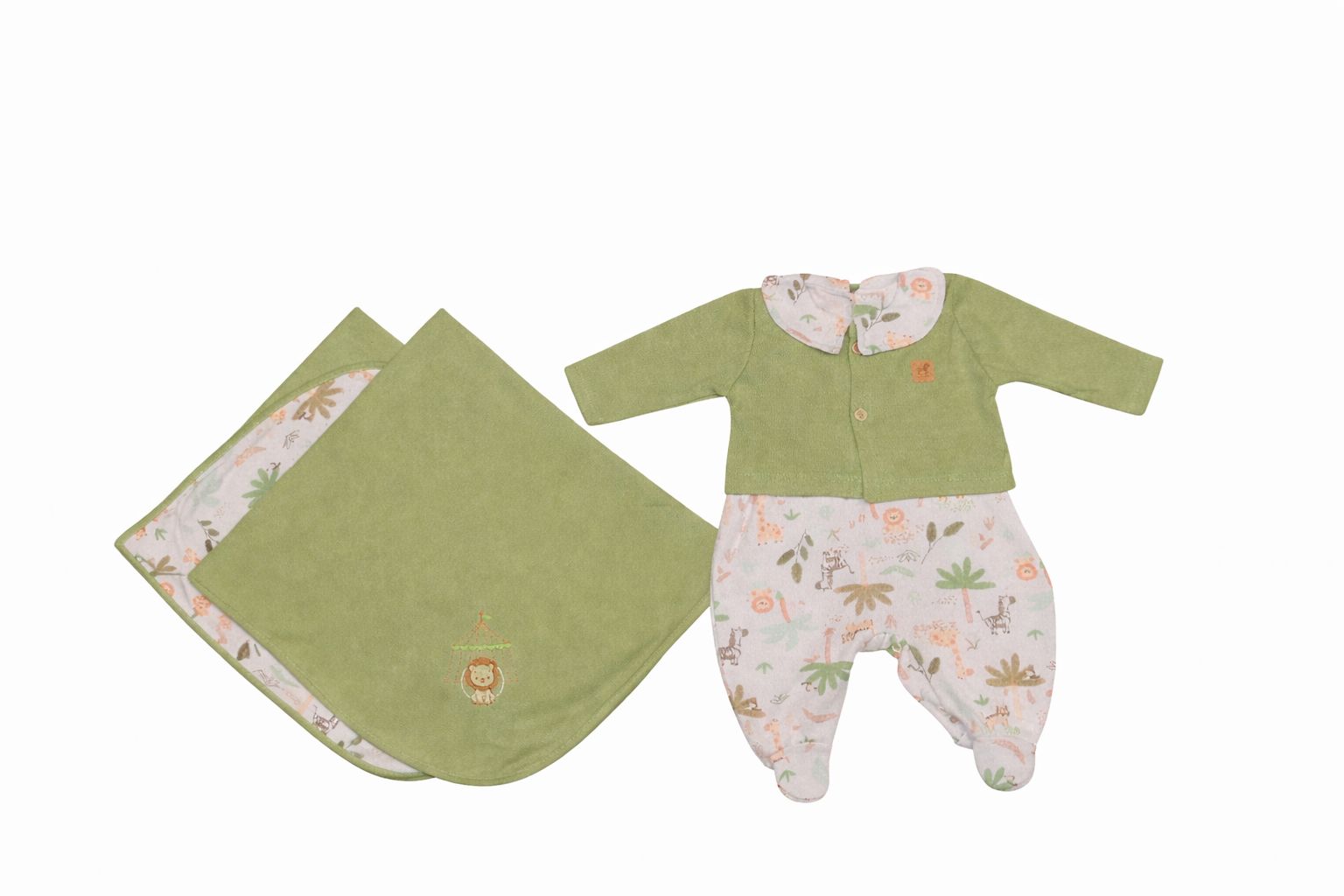Saída Maternidade Estilinho – Macacão + Casaco + Manta Dupla Bordada em Suedine Penteado